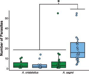 The study found that city lizards weren’t more frequently infected with parasites. However, there were differences between species. Brown anoles were more frequently infected with parasites than crested anoles. In addition, when comparing parasite intensity (total number of parasites) brown anoles from the city had twice as many parasites than forest anoles (Fig. 2). Crested anoles were less likely to be infected and had fewer parasites.