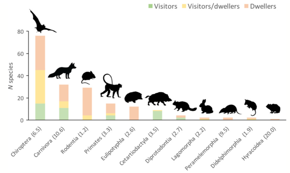 Santini and colleagues analyzed 190 mammal species commonly found in urban environments worldwide. Their dataset included an impressive array of mammals from all different lifestyles: carnivores, bats, rodents, primates, rabbits, shrews, and more. This compiled list alone makes this work a wonderful contribution to urban evolutionary research (check out the full list of species included). So many more species of mammals are found in cities than we see on a daily basis (which means so many species to study!). Using phylogenetic path analysis, they then examined which behavioral, ecological, and life history traits were correlated with urban tolerance across species. Specifically, they considered traits related to dispersal ability, behavioral and cognitive plasticity, diet, and reproduction and asked to what extent these traits increased the probability that species are occasionally found in urban areas (“visitors”) versus living in and using the urban habitat (“dwellers”).