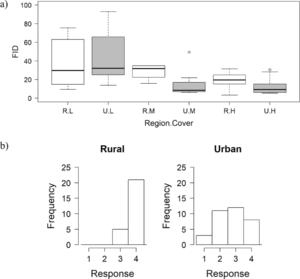 Figure 1: Top panel shows comparison of flight initiation distances of urban (U) and rural (R) sites at low (L), medium (M) and high (H) vegetation cover. Bottom panel quantifies they fearfulness when animals were approached (4 extremely fearful, 1 animal remained close to original locale).