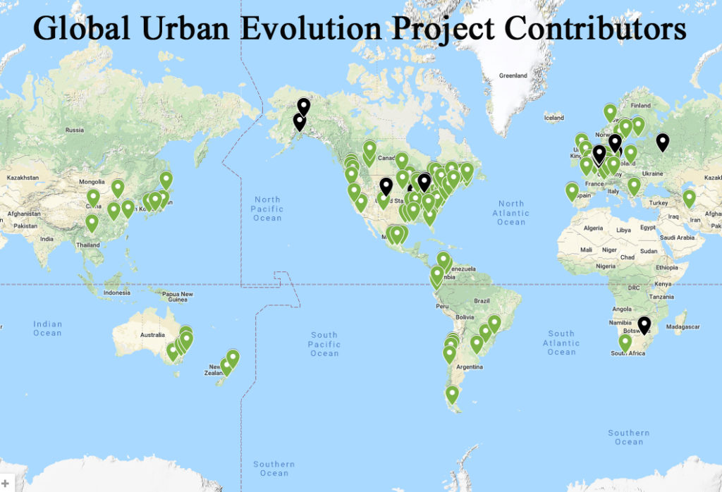 When it comes to current studies on urban plant evolution, The Global Urban Evolution Project (GLUE Project) is by far the most robust in terms of replication at a global scale. This worldwide collaboration spans every continent except Antarctica and includes hundreds of contributing researchers. The GLUE Project aims to answer two main questions: 1) are cities driving parallel evolution in plants at a global scale and 2) what selective pressures play a role in whether or not plants adapt to city life?