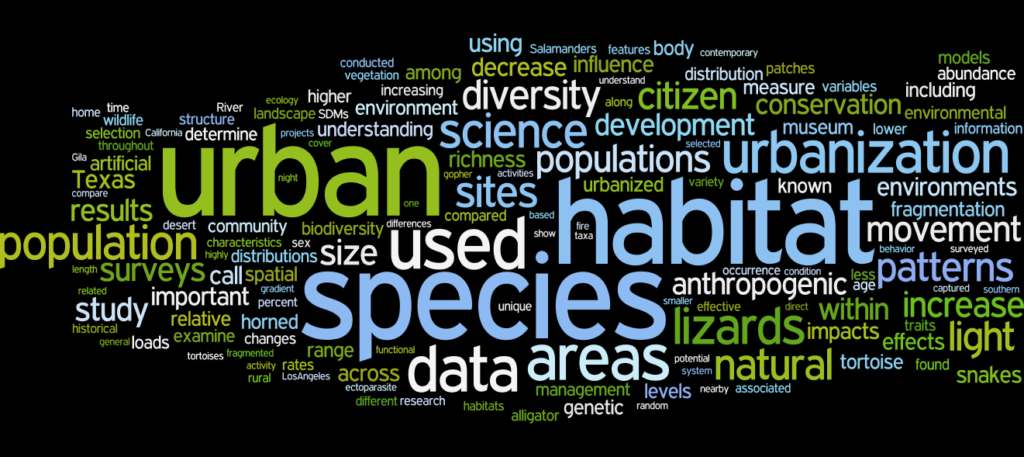 Nevertheless, I scoured the abstracts to see what cool things people are doing with urban animals. It looks like I’m missing out on some great talks! Check out the wordcloud below that I made from the abstracts and the list of talks all mentioning urbanization in their abstracts. If you’re attending the meeting, I hope this list helps you hear some interesting urban ecology and evolution research! And better yet, consider writing up a short post on the blog about any talks or posters you visit (just send Kristin an email). Enjoy the meeting if you’re going, and if not, I’m right there with you in your FOMO.