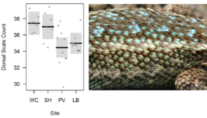 Lizards at the most urban site also experienced warmer temperatures throughout the year, confirming that there is likely an urban heat island effect. How can these lizards deal with the heat? They might respond behaviorally by seeking cool, shady spots. Additionally, they could respond morphologically by changing a physical trait that affects evaporative water loss (the process that happens when you sweat). Lizards are in the clade Lepidosauria along with the tuatara and snakes (snakes are actually a group of lizards making the term “lizard” incorrect, but that discussion is for another day). Lepidosauria means “scaled lizard” and lizards indeed have hard keratinized scales covering their skin. Lizards’ skin is exposed between the scales and the more skin exposed, the more evaporative water loss occurs. Lizards with many small scales have more skin exposed than lizards with fewer large scales. Therefore we might expect the urban heat island effect to influence the number of scales on an urban lizard. This is exactly what we found! Urban lizards had fewer scales than lizards living in more natural areas, consistent with living in a warmer habitat (because fewer large scales will reduce skin exposed and evaporative water loss).