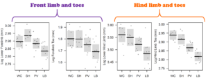 At each site, we measured how western fence lizards used the habitat and then related their behaviors to morphological traits, such as limb length. We found that urban lizard populations used more human-made substrates (e.g. buildings and walls instead of trees), were found on a broader range of substrate types (wood, rock, ground, other materials), and tended to be more ground-dwelling than natural lizard populations. These differences in habitat use were strongly associated with limb and toe lengths—urban lizards had shorter limbs and toes than natural lizards! Although we did not test whether shortened limbs and toes affect the performance of lizards at urban sites, our results are consistent with previous research which showed that lizard populations found in rocky habitats (like the concrete urban environment) tend to have shorter limbs than lizard populations found in woodland habitats.