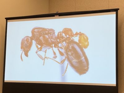 Most of the talks looked at biodiversity of arthropods in some type of urban context. Steven Frank explained that the diversity of dung beetles is lower in urban compared to rural locations and that these beetles prefer hog dung to dog dung. Kayla Perry found that shrinking cities are great for increasing arthropod diversity, with more biodiversity in reclaimed green lots than in urban parks. Alex Wild identified two new ant parasites of queen ants in an urban field research station.