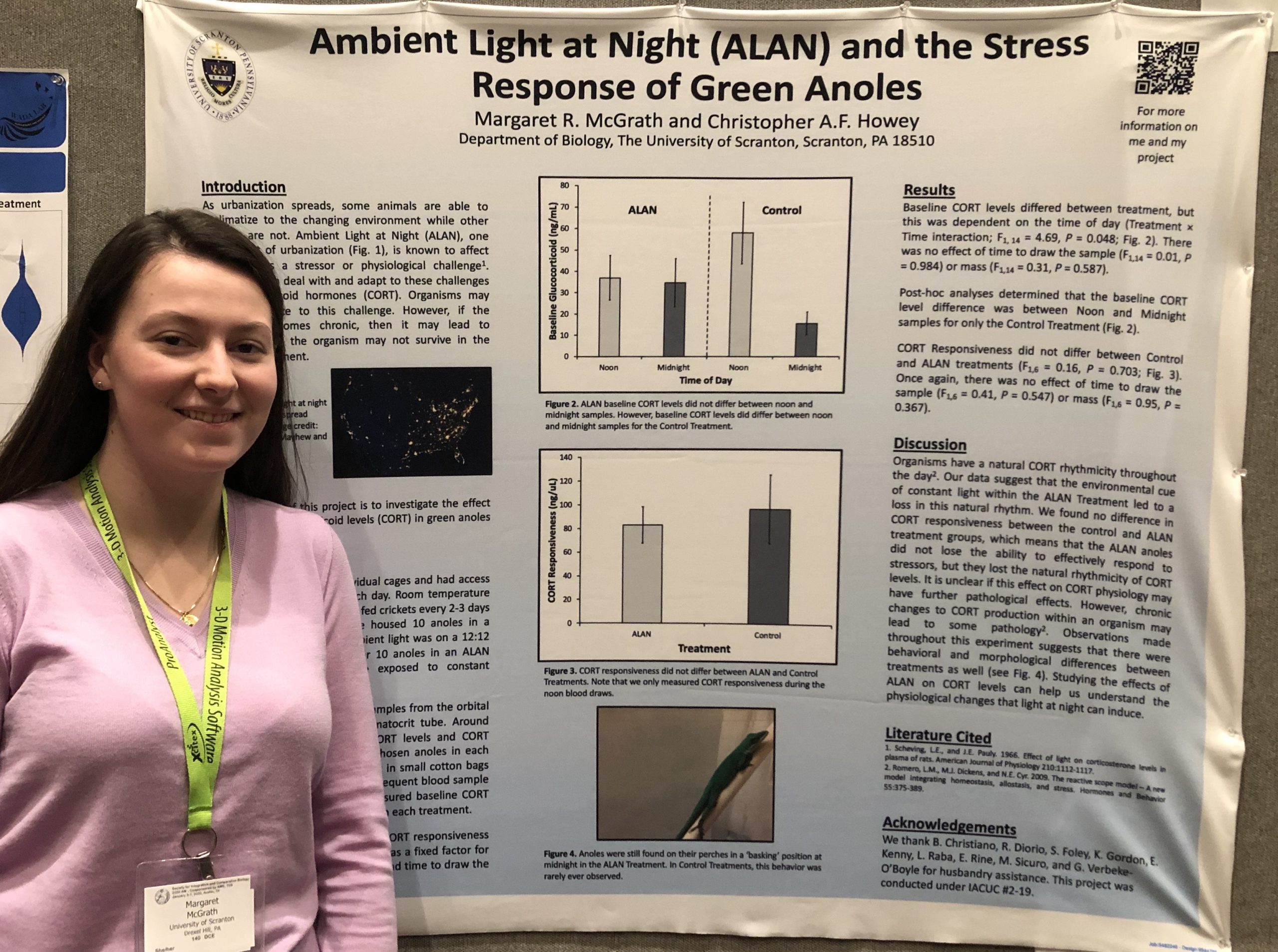 Margaret McGrath, an undergraduate in Dr. Christopher Howey’s lab at the University of Scranton, is examining the impact of ALAN on glucocorticoids in green anoles (Anoles carolinensis), which are commonly found in urban environments. Margaret specifically examined the impact of ALAN on the daily rhythmicity of corticosterone (CORT) and CORT responsiveness to an environmental stressor. She exposed green anoles to either a natural light-day cycle of 12 hours of light and 12 hours of dark or 24 hours of light. After 6 weeks, Margaret performed competitive immunoassays to measure baseline CORT levels at midnight and noon. Additionally, she measured CORT responsiveness after the green anoles were exposed to an environmental stressor (placed in a bag for 30 minutes).