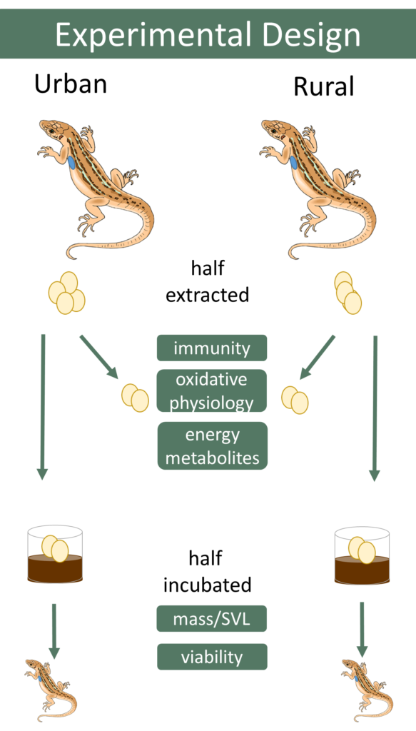 Emily captured groups of side-blotched lizards from the city core of St. George, UT and surrounding rural areas. Because these lizards make clutches with multiple eggs, Emily designed an experiment in which she took some eggs from each clutch to measure their physiological qualities while incubating others until hatching to measure offspring traits. She extracted yolk samples from eggs and measured energy content, immune function, and oxidative physiology.
