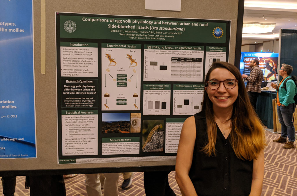 Many species of lizards exploit urban habitats and thus may be good candidates for studying the impacts of urbanization on maternal effects on egg quality. Previous research has pioneered methods for assessing egg yolk contents in lizards, but we do not have a good understanding of how urbanization may impact lizard egg and hatchling quality. Emily Virgin, a graduate student in Susannah French’s lab at Utah State University chose to investigate how mothers and offspring of sideblotched lizards (Uta stansburiana) are affected by urbanization.