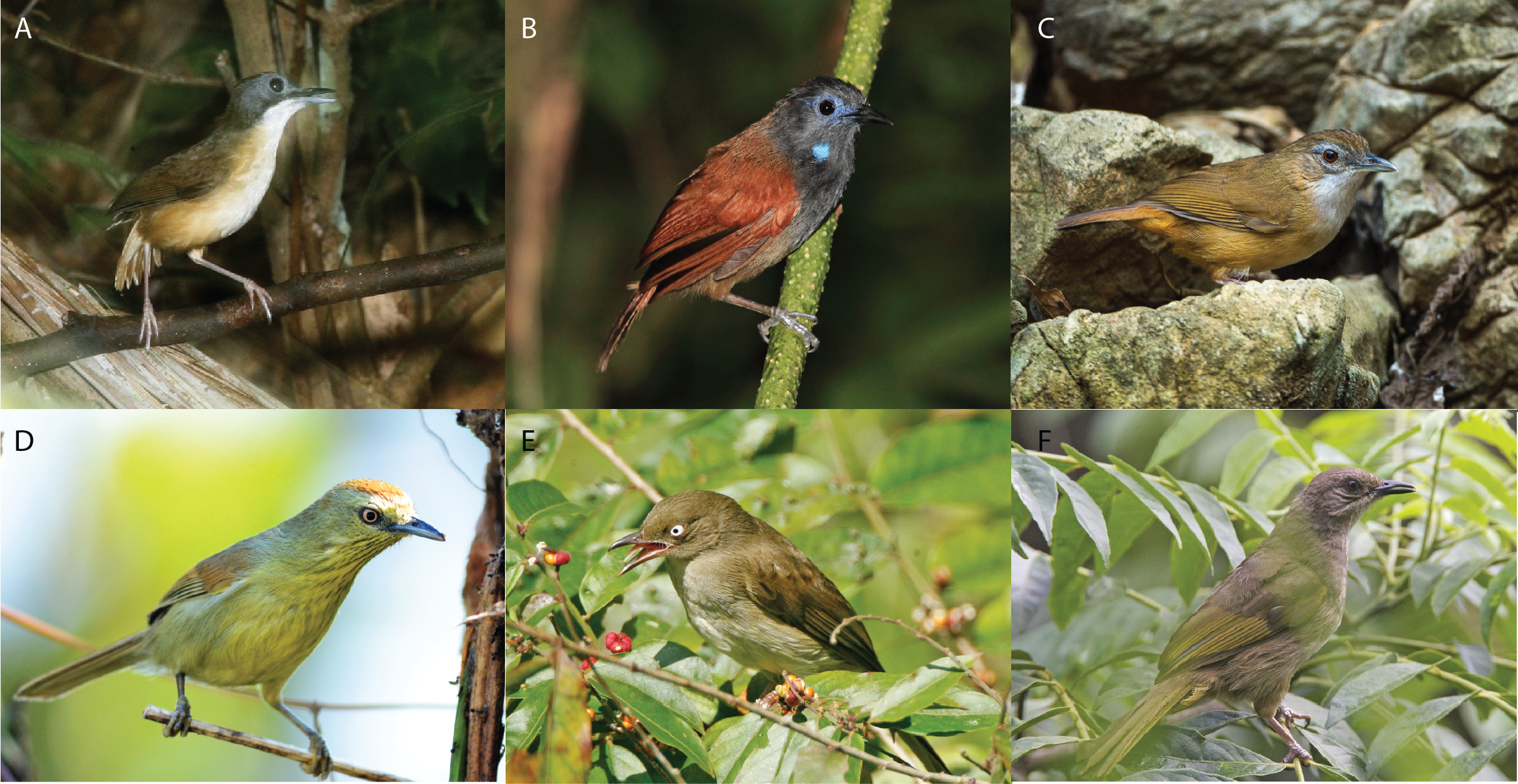 A. Short-tailed Babbler (Malacocincla malaccensis) by Lip Kee licensed under CC BY-SA 2.0. B. Chestnut-winged Babbler, Danum Valley, Borneo by Nigel Voaden licensed under CC BY-SA 2.0. C. Abbot’s Babbler – Thailand_S4E7468 by Francesco Veronesi licensed under CC BY-SA 2.0. D. Yellow-breasted Babbler or Pin-striped Tit-babbler Mixornis gularis or Macronus gularis by Dr. Raju Kasambe licensed under CC BY-SA 4.0. E. Pycnonotus simplex by Lip Kee licensed under CC BY-SA 2.0. F. owb Pycnonotus plumosus by Lip Kee licensed under CC BY-SA 2.0.