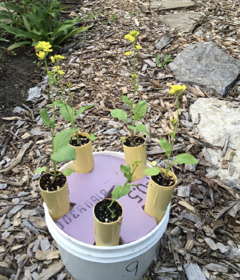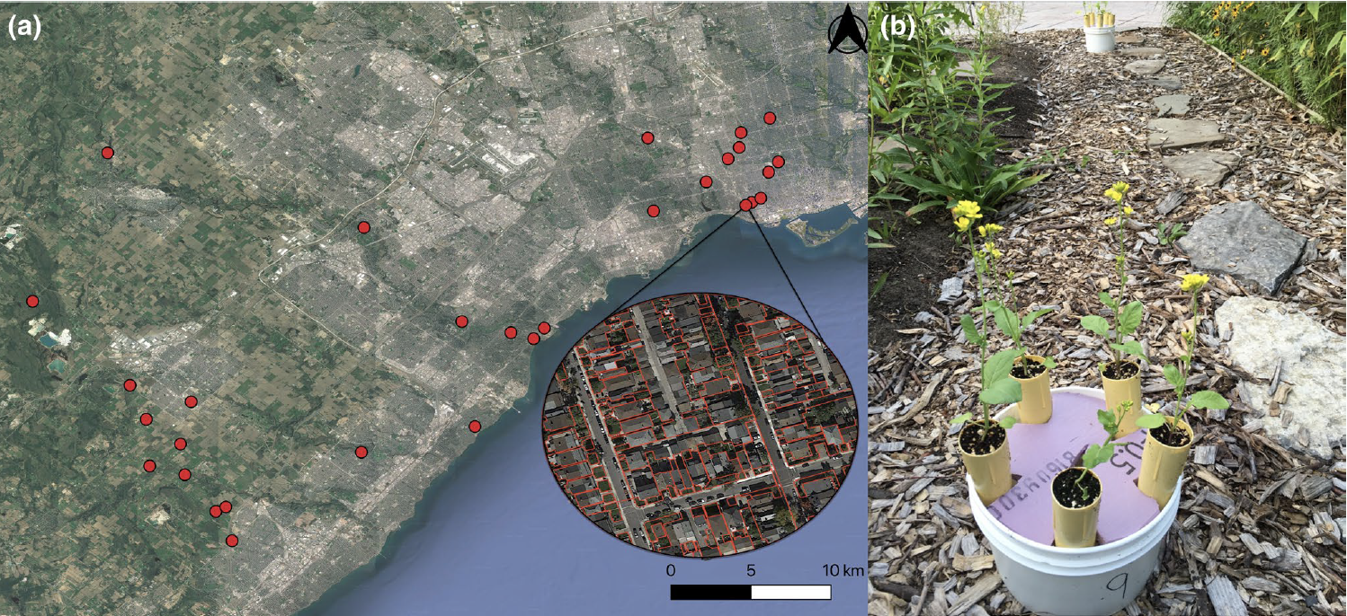 (a) Map of Toronto with the 30 sampling sites and (b) bucket with the 5 plants at sitesTo test these hypotheses, the authors created 30 artificial populations of rapid-cycling Brassica rapa along an urbanization gradient in the Greater Toronto Area. Over the course of two years, they measured how pollinator-mediated plant reproduction and pollen dispersal changed with the amount of impervious surface surrounding a population and distance from the city center. They paired these measurements with pollinator observations conducted at a subset of sites, to understand if changes in plant reproduction were associated with variation in the pollinator community along the gradient.