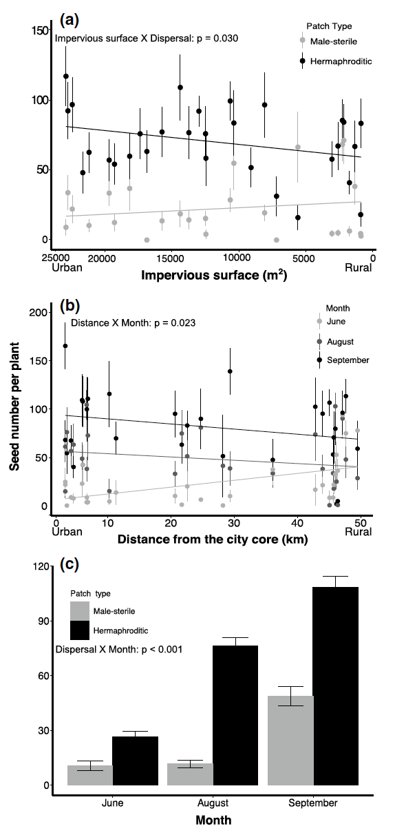 These results are most consistent with the Urban Pollinator Deficit Hypothesis. However, the effect of urbanization on seed production varied across the season: seed number was highest in urban populations early in the summer, but this trend reversed later in the season. This trend corresponded with greater pollen dispersal that was early in the summer. These results are most consistent with the Urban Pollinator Enrichment Hypothesis. The fine-scale environmental conditions of the cities, the extent of habitat fragmentation, and level of connectivity between plant patches likely play a role in explaining these trends. The authors recommend incorporating environmental and landscape features of cities to help inform predictions of the effects of anthropogenic disturbance on urban plant-pollinator interactions.