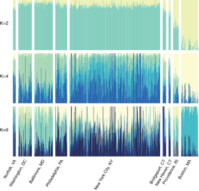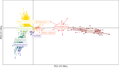 Figure 2: DAPC showing the separation of the Boston and Providence samples along with x-axis, and the separation of New York City/Philidelphia samples and Baltimore/Washington, DC samples across the y-axis. Figure from Carlen & Munshi-South (2020).