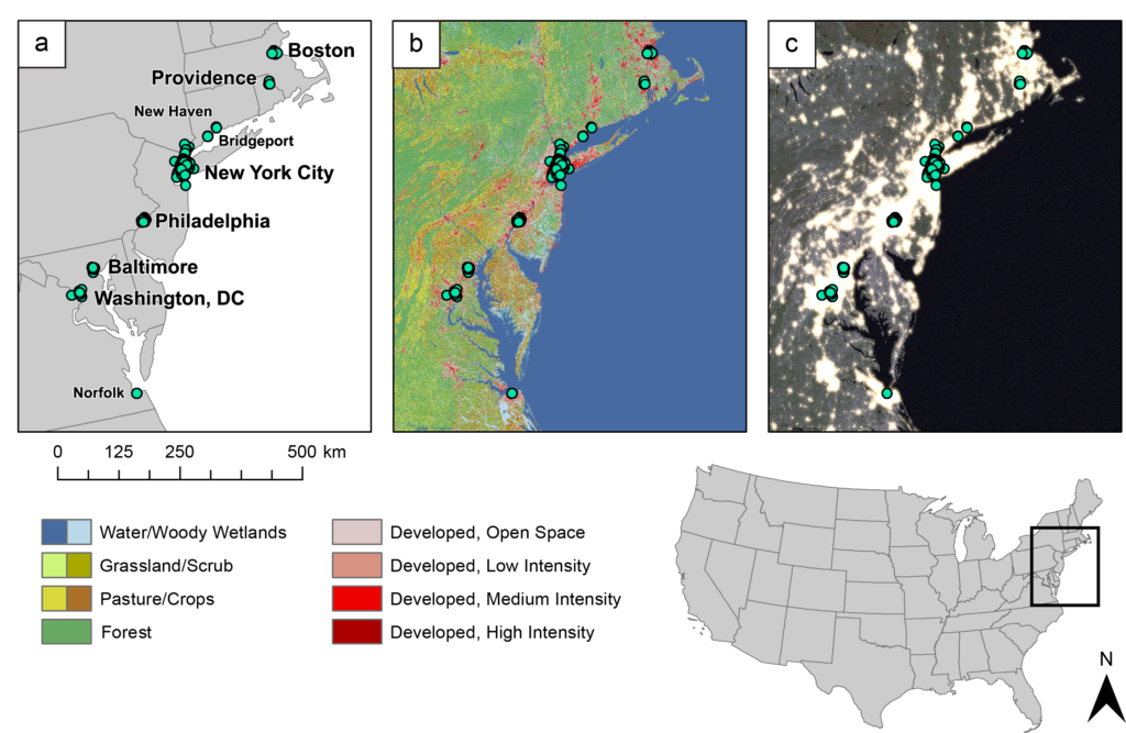 Figure 5. Maps showing sampling location including (a) cities where samples were collected, (b) National Land Cover Data (NLCD v.2011; Homer et al., 2015), and (c) light intensity at night (NASA Earth Observatory, 2017). Sample locations are shown as teal circles. Note that while National Land Cover Data (NLCD) is often used to indicate urbanization, NASA’s Earth Observatory images of artificial light at night shows the interconnectedness of urbanization that is missed by landcover data. Figure from Carlen & Munshi-South 2020.