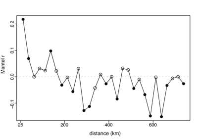 Figure 4: Mantel correlogram showing the relationship between genetic distance and geographic distance within each 25 km distance class. Each circle represents a distance class, and filled circles represent significant associations (α = 0.05). Figure from Carlen & Munshi-South 2020.