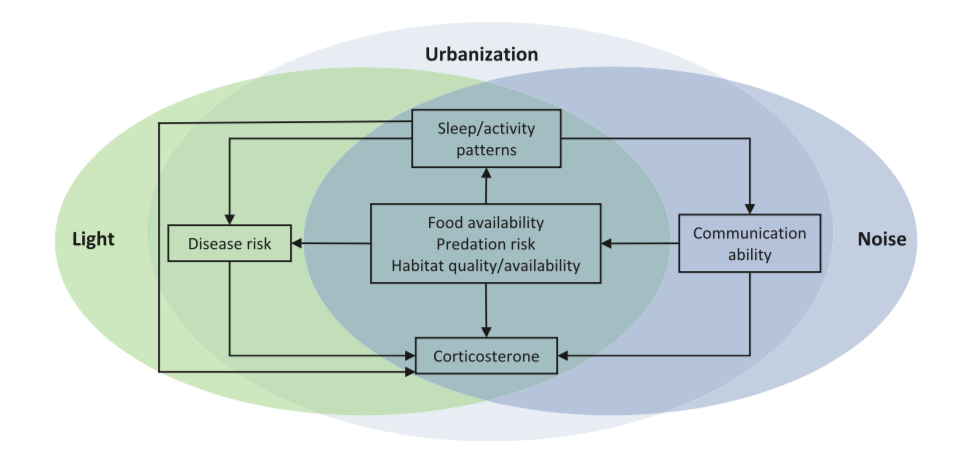 Anthropogenic stressors may impact organismal stress levels and consequently stress hormone concentrations, via complex pathways (Fig. 1, above). And these stressors may extend far beyond the limits of the city. For example, even in remote rural locations, the glow of faraway cities can often be seen.