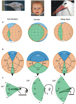 Variation in the visual fields of birds compared to humans (Martin, 2009).