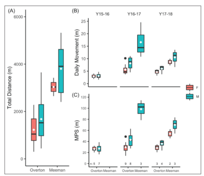 Figure 1: Movement metrics of Copperhead snakes at urban Overton Park and rural Meeman Biological Station by location and sex. White diamonds denote means. (A) Average total distance moved. (B) Aver- age daily movement and (C) average movement per sampling (MPS) also represented by year, as effect was significant. Image from Carrasco-Harris et al. (2020).