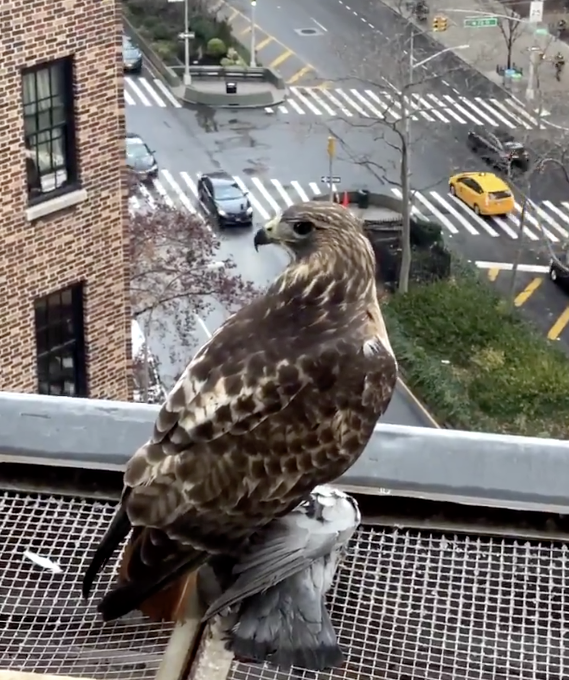 Pigeons are one of the most common, iconic birds we see in cities. Did you know that pigeons are prey for larger, predatory birds? We like Red-tailed hawks so much they’ve been featured as our urban observation multiple times. Here, we see a New York City red-tailed hawk that caught a pigeon for lunch.