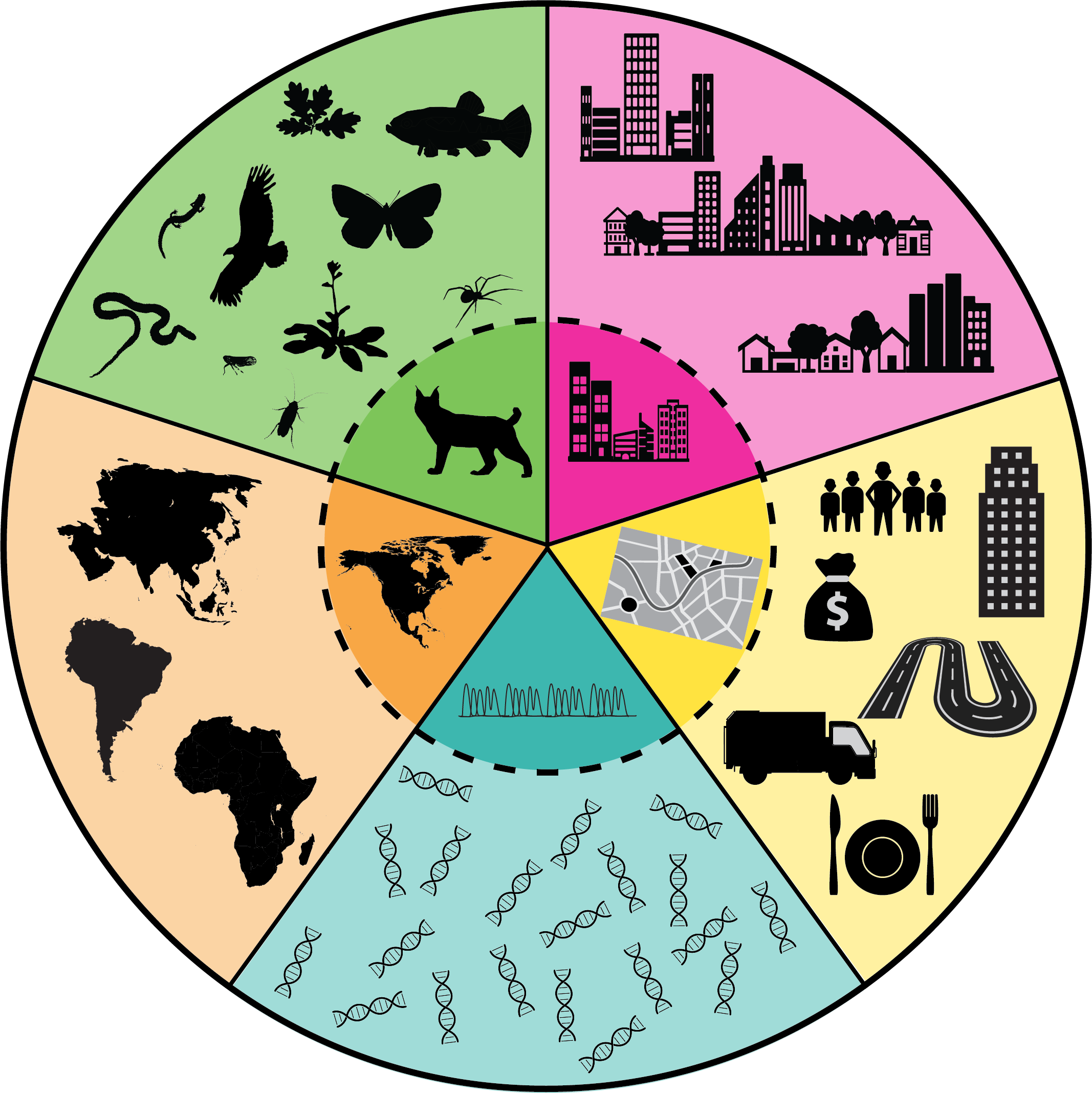 Featured Image: Conceptual diagram illustrating the current state of urban landscape genetics research and the recommendations for future research programs. The inner dashed circle visualizes the current state of urban landscape genetics research, which is heavily biased towards studies of mammals (green), single cities (pink), urban metrics that are often limited to roads and development (yellow), microsatellites (blue), and North America (orange). The outer circle represents our recommendations for future research, including a greater diversity of taxa (green); comparison of multiple cities with different socioeconomic demographics (pink); the inclusion of multiple measures of urbanization including socioeconomic metrics (yellow); the use of genome-wide SNP datasets (blue); and a focus on Asia, Africa, and South America where urbanization is accelerating at the most rapid rates. Image from Fusco et al. (2021).