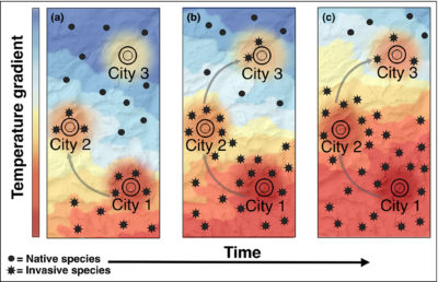 Urban evolution may facilitate the establishment of invaders in multiple ways. First, since urban ecosystems around the world have relatively similar environmental conditions (Grimm et al., 2008), if a species evolves to succeed in cities in one region, this population may become a source for invasive populations in cities in other regions. Once introduced to a new non-native range and established in a new city, the growing population will be increasingly likely to escape and spread into the surrounding natural areas (Fig. 2). In this way, cities could act as “gateways” among regions and continents for urbanized invaders. Importantly, this process could also create gateways across environmental gradients that would otherwise function as environmental filters preventing establishment. For example, the urban heat island effect in conjunction with urban evolution might facilitate the establishment of tropical invaders in more temperate regions, allowing them to bypass the environmental filter of colder climates (Fig. 3a).