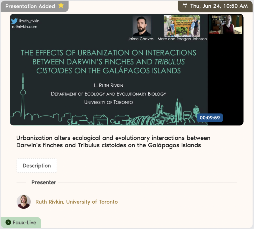 10:50 Ruth Rivkin (University of Toronto): Urbanization alters ecological and evolutionary interactions between Darwin’s finches and Tribulus cistoides on the Galápagos Islands