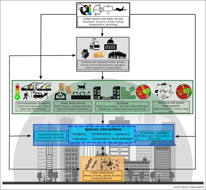 Cities are expanding worldwide and urbanisation is considered a global threat to biodiversity. Urban ecology has provided important insights on how urban environmental changes might affect individuals, populations and species; however, we know little about how the ecological impacts of urbanisation alter species interactions. Species interactions are the backbone of ecological communities and play a crucial role in population and community dynamics and in the generation, maintenance and structure of biodiversity. Here, I review urban ecological studies to identify key mechanistic pathways through which urban environmental processes could alter antagonistic and mutualistic interactions among species. More specifically, I focus on insect predation, parasitoidism and herbivory, competition, insect host-pathogen interactions and pollination. I furthermore identify important knowledge gaps that require additional research attention and I suggest future research directions that may help to shed light on the mechanisms that affect species interactions and structure insect communities and will thus aid conservation management in cities.