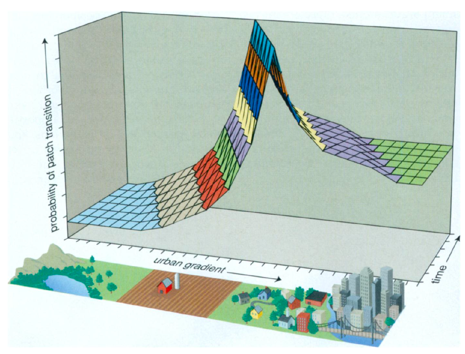 The papers following this sought to build a more robust and inclusive social-ecological thought that truly captured the cityscape. Redman et al. 2004 offered insight into how bridging multiple disciplines can create a framework that generates stronger, and more in-depth, questions about the landscape. They do this by reviewing previous efforts in long-term ecological research and expanding on topics by identifying questions that could be asked, interrogating scale use, and general concepts that are important when doing transdisciplinary work. For example, they explicitly identify several social science patterns/processes that may be important to consider in a particular study (e.g., economic growth, demography) while highlighting key ways we think about ecosystems. Collins and others added to this discussion in 2011 by integrating Press-Pulse Dynamics. Press dynamics are slower, ongoing processes in the environment, both social and biophysical (e.g., sea-level rise, global warming), while pulse dynamics are quicker, short events that can dramatically alter the ecosystem and its services (e.g., hurricanes, flash floods) and thus are harder to integrate into frameworks because of their unpredictability. Unlike previous social-ecological frameworks (e.g., Redman et al 2004), this paper integrates ecosystem services and how these services fluctuate/are impacted by human behavior.