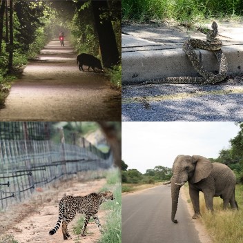 Featured Image: Upper left: human and wild boar (Sus scrofa) in the city of Berlin, Germany, upper right: two puff adders (Bitis arietans) during a mating ritual on a street close to the city of Windhoek, Namibia; lower left: a cheetah (Acinonyx jubatus) patrolling a fence on a reserve in Namibia; lower right: African elephant (Loxodonta africana) crossing a tarred road in South Africa; all photos: Thomas Göttert via Special Issue “Human Wildlife Conflict across Landscapes”