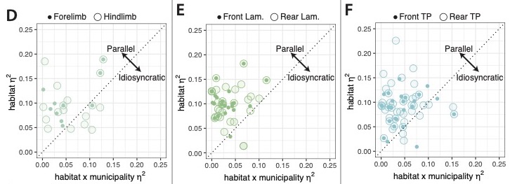 Finally, we wanted to know if the same genetic changes underlie the parallel morphological changes that we observed. Using a couple of different approaches, we found that the same genomic targets of selection underlie urban-associated morphological divergence across populations. In other words, adaptive divergence in urban lizards is occurring via repeated selection on the same genetic regions independently across the three cities we looked at.