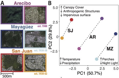 Our study started with the idea that it is essential to connect environmental, phenotypic, and genomic changes to understand how evolutionary processes shape adaptations in novel environments. Without all three of these, we have an incomplete picture. For example, if we don’t know how the environment differs, we can only guess what phenotypic changes mean; similarly if we don’t know how phenotypes differ, we can only guess what genomic changes mean. Thus we first showed that the urban environments we studied exhibit parallel changes before digging into the genomics. Focusing on three pairs of urban-forest populations across the island of Puerto Rico, we showed that urban habitats diverge in parallel from their forest counterparts in multiple environmental dimensions.
