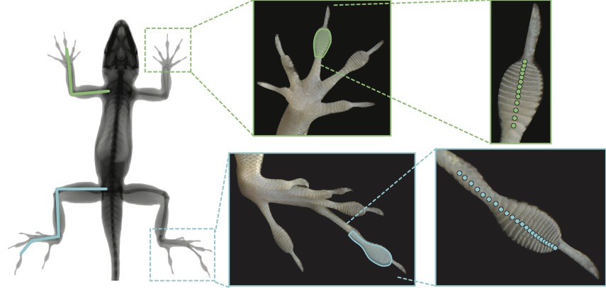 This parallel environmental divergence sets the stage for parallel adaptive phenotypic and genomic divergence as a consequence of parallel selection pressures. To test this hypothesis, we sampled 96 lizards from these paired urban and forest sites, took digital xrays and high-resolution images, sampled a small piece of the tail (which grows back in this group of lizards), and released the lizards back into their habitats to live our their lives. Back in the lab, we then measured 6 key morphological traits (below: limb length, toepad area, and number of specialized scales known as lamellae) and extracted DNA from the tissue samples. We sequenced a subset of the DNA that codes for genes (the exome).