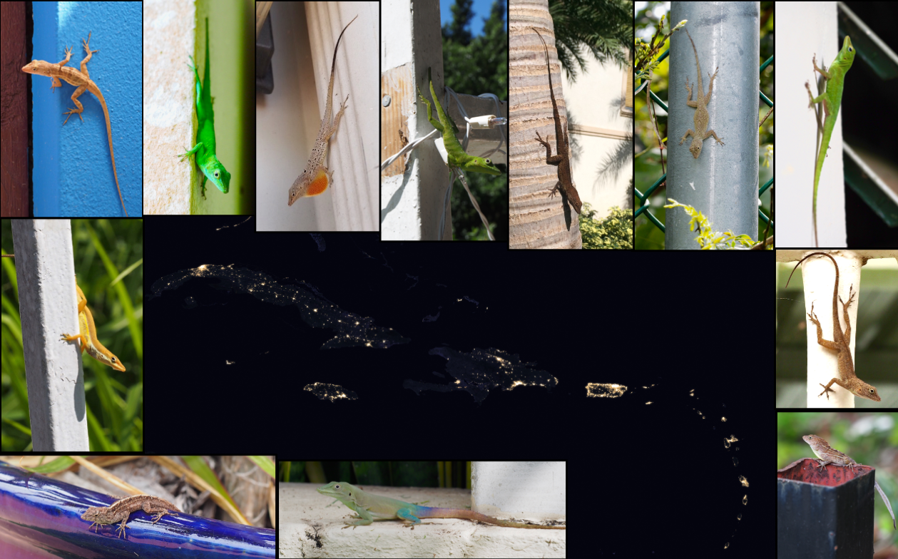 Anoles are also models for urban evolution. Why? Anoles are found abundantly across the Caribbean in urban and forest environments where they specialize in divergent microenvironments characterized by shifts in climate and physical structure. Urban habitats tend to be warmer, drier, more open, and dominated by buildings and impervious surfaces instead of vegetation — providing the perfect opportunity for repeated adaptation to a novel combination of environmental conditions. In other words, Caribbean cities provide a replicated natural laboratory to study adaptation as it happens when these lizards colonize and thrive in urbanizing areas. And there is no shortage of urban-tolerant and urbanophilic anole species to choose from!