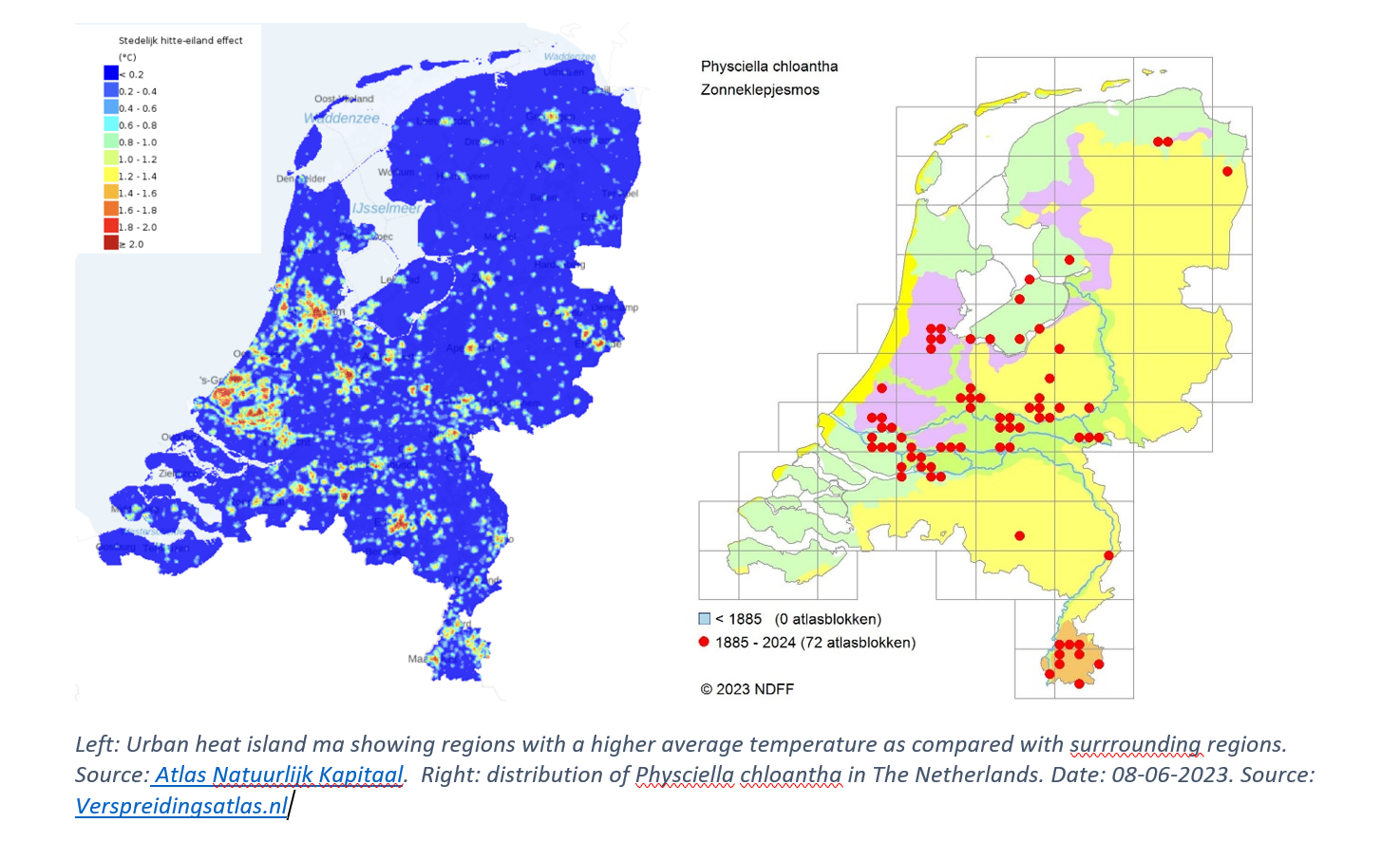 When the distribution of the species in the Netherlands is compared to an urban heat island (UHI) map, which shows relatively increased temperatures compared with the non-urban surroundings, it becomes quite apparent that the localities seem to overlap nicely with the regions most affected by the UHI. Keep in mind that there is a sampling bias as not every city or region in the Netherlands has a local lichenologist. The current distribution model is far from complete (especially when considering that the species is spreading at a fast rate). Despite this, the species characterizes itself by being recorded regularly in the most urbanized or ‘warmer’ regions, like Amsterdam, Rotterdam, and Utrecht. It has also been recorded in urban areas of the far north (Groningen) and south (Limburg), without observations in the more rural areas separating these urban spaces.