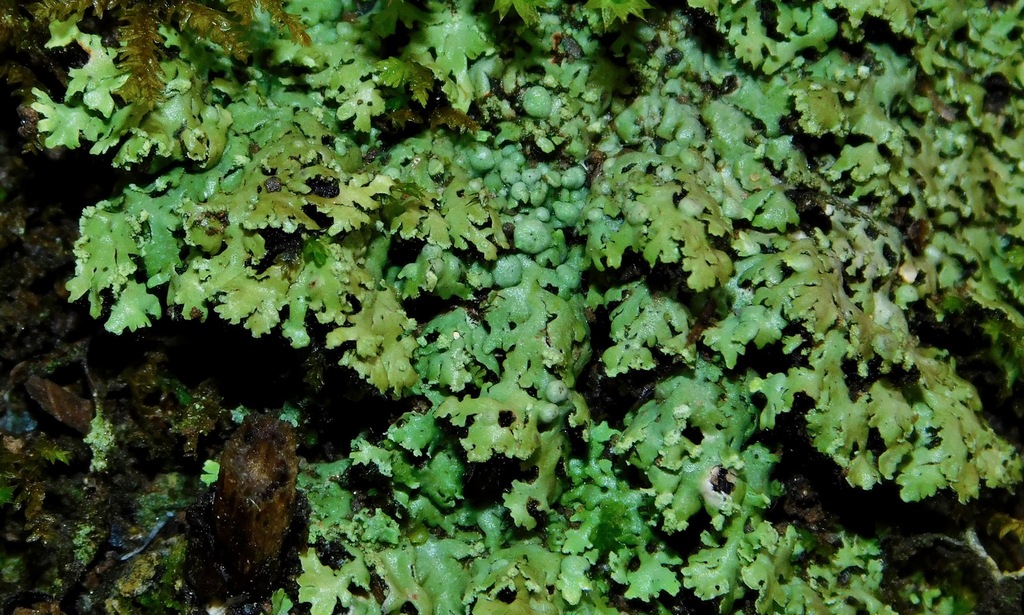 Physciella chloantha is shown with a fertile apothecium and the lobes producing vegetative soralia