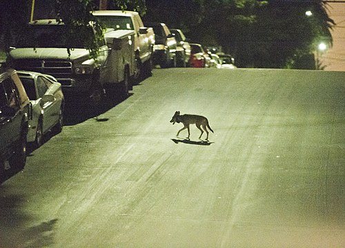Coyotes in and around downtown Los Angeles photographed on location with NPS ecologist Justin Brown Wednesday Night July 15 and Thursday morning July 16, 2015. Coyote C-144 and C-143. (Source: Wikipedia)